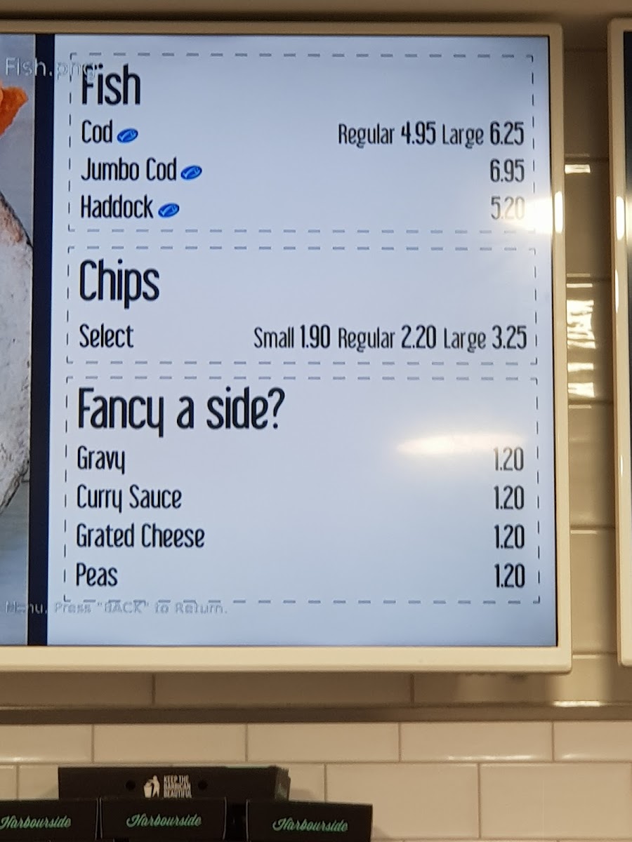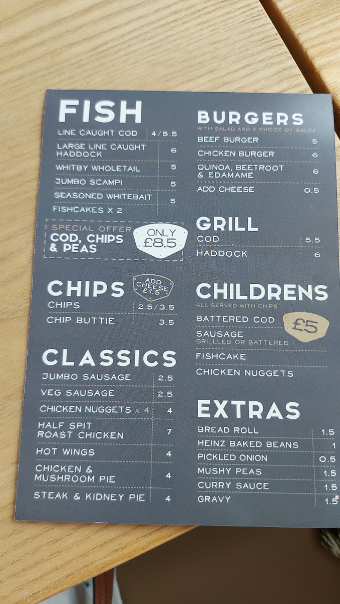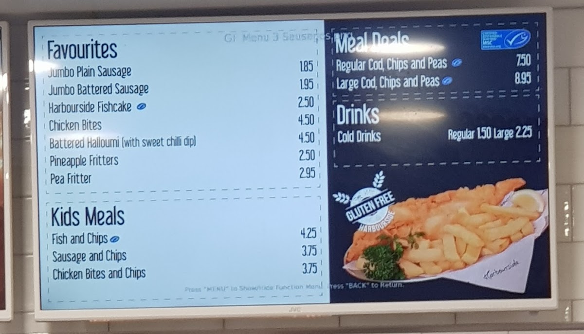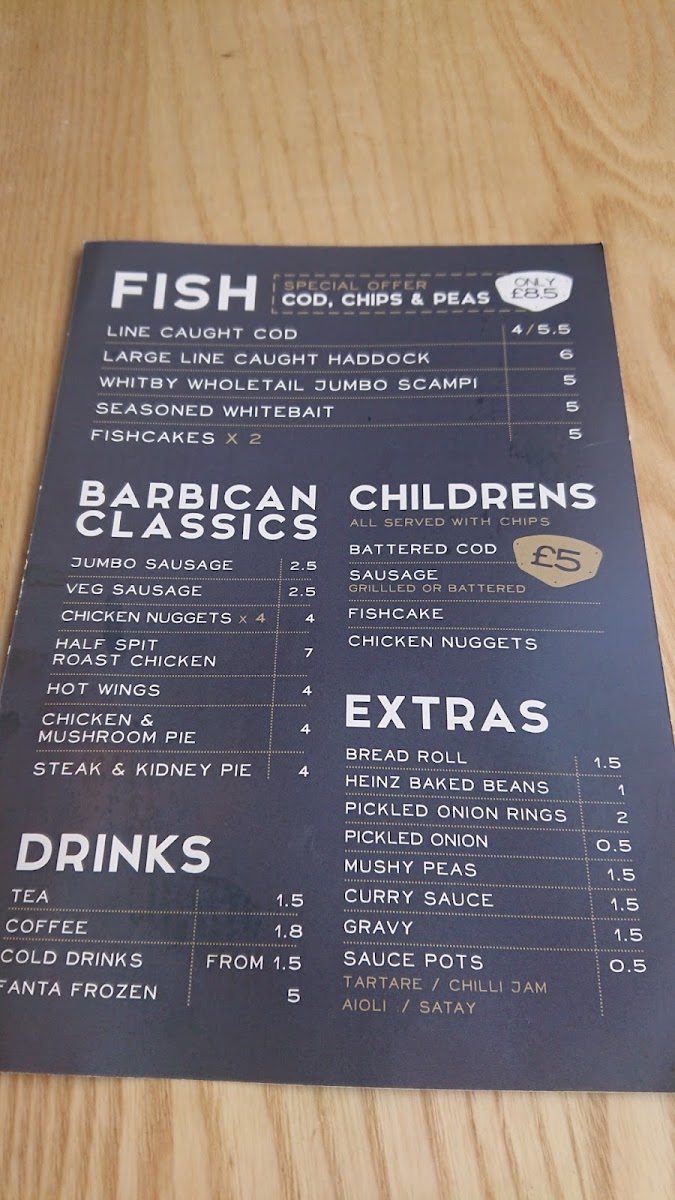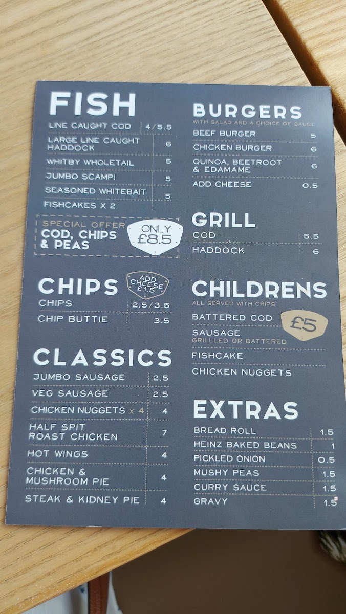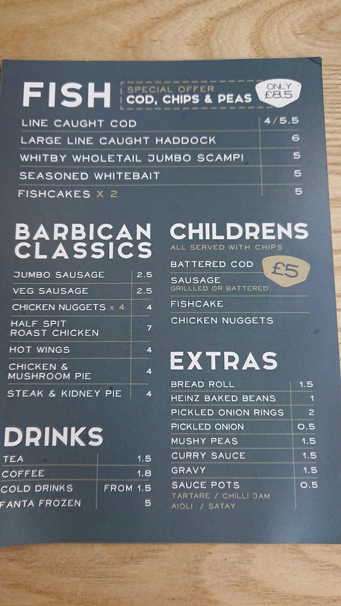 From a reviewer’s perspective, the menu at Harbourside Gluten Free @ Barbican Fish Bar offers a satisfying range of classic British comfort food with a gluten-free focus, even if specific prices aren’t listed. The Meal Deals like Regular Cod, Chips & Peas and Mini Cod & Chips provide reliable staples, while the burger selection-from Beef Burger to Double Cheese Burger and Grilled Chicken Burger-adds hearty variety. Families are well catered for with options such as Kid's Cod and Kid's Sausage Or Nuggets, and the sides, including Curry Sauce and Bread Roll, complement the mains nicely. The seafood selection stands out, particularly Line Caught Cod, Large Line Caught Haddock, and Whitby Wholetail Jumbo Scampi, alongside lighter bites like Seasoned Whitebait. There’s also a thoughtful inclusion of vegetarian choices like Veggie Sausage, Aromatic Garden Burger, and Pea Fritter, ensuring broader appeal. Traditional favourites such as Chicken & Mushroom Pie and Steak & Kidney Pie, plus grill options like Cod and Haddock, round out the menu, while extras like Mushy Peas and Heinz Baked Beans maintain that authentic fish-and-chip shop feel. Overall, the menu is diverse, comforting, and clearly designed to deliver familiar flavours in a gluten-free format without sacrificing choice.